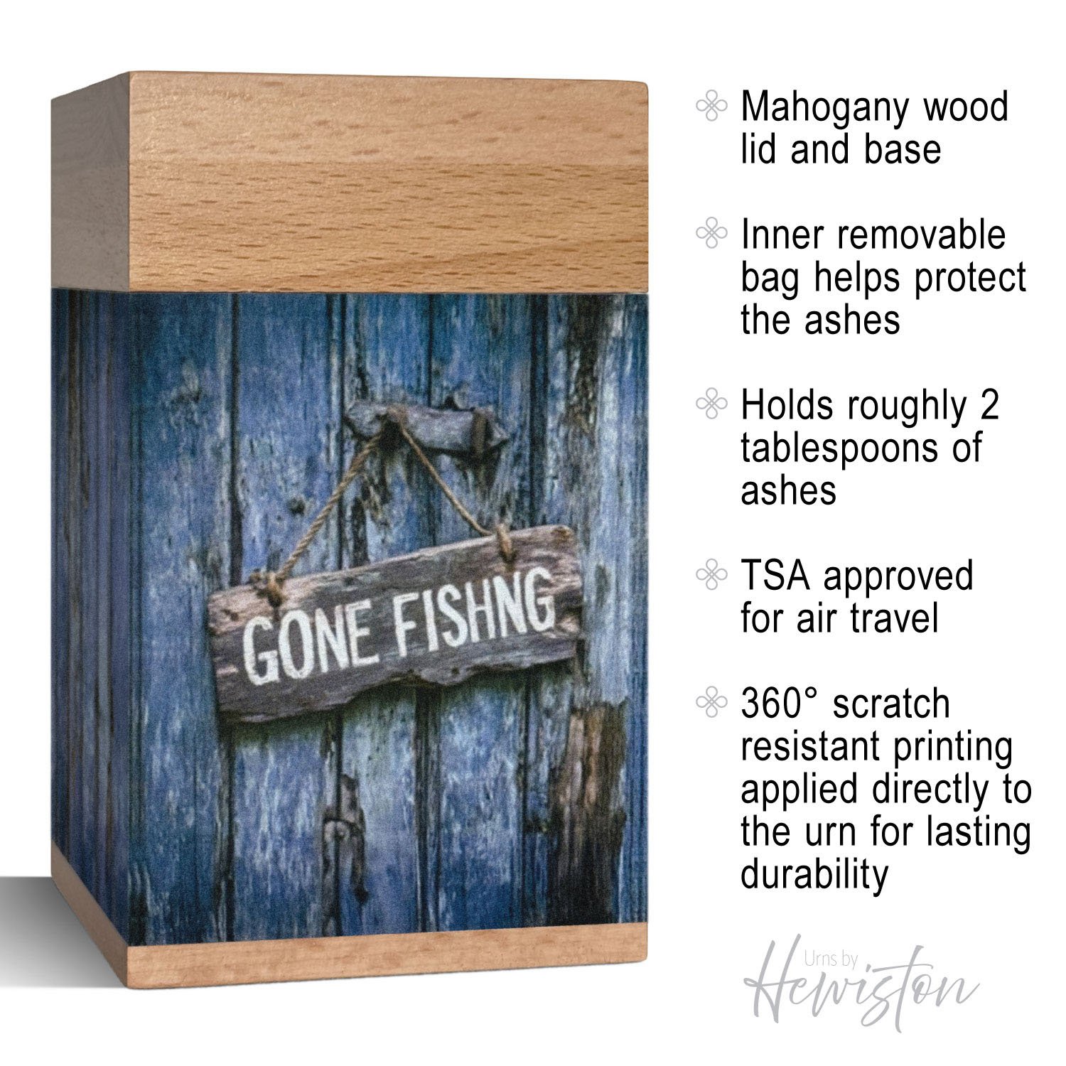 - TIMELESS STYLE: This small contemporary wooden urn for ashes complements any home décor, serving as both a beautiful memorial urn and a heartfelt tribute. The rustic “Gone Fishing” design reflects a life well-lived and a love for quiet moments by the water’s edge or in nature’s embrace. Perfect for men or women, it’s a graceful urn for human ashes that honors your loved one’s spirit with warmth and authenticity.