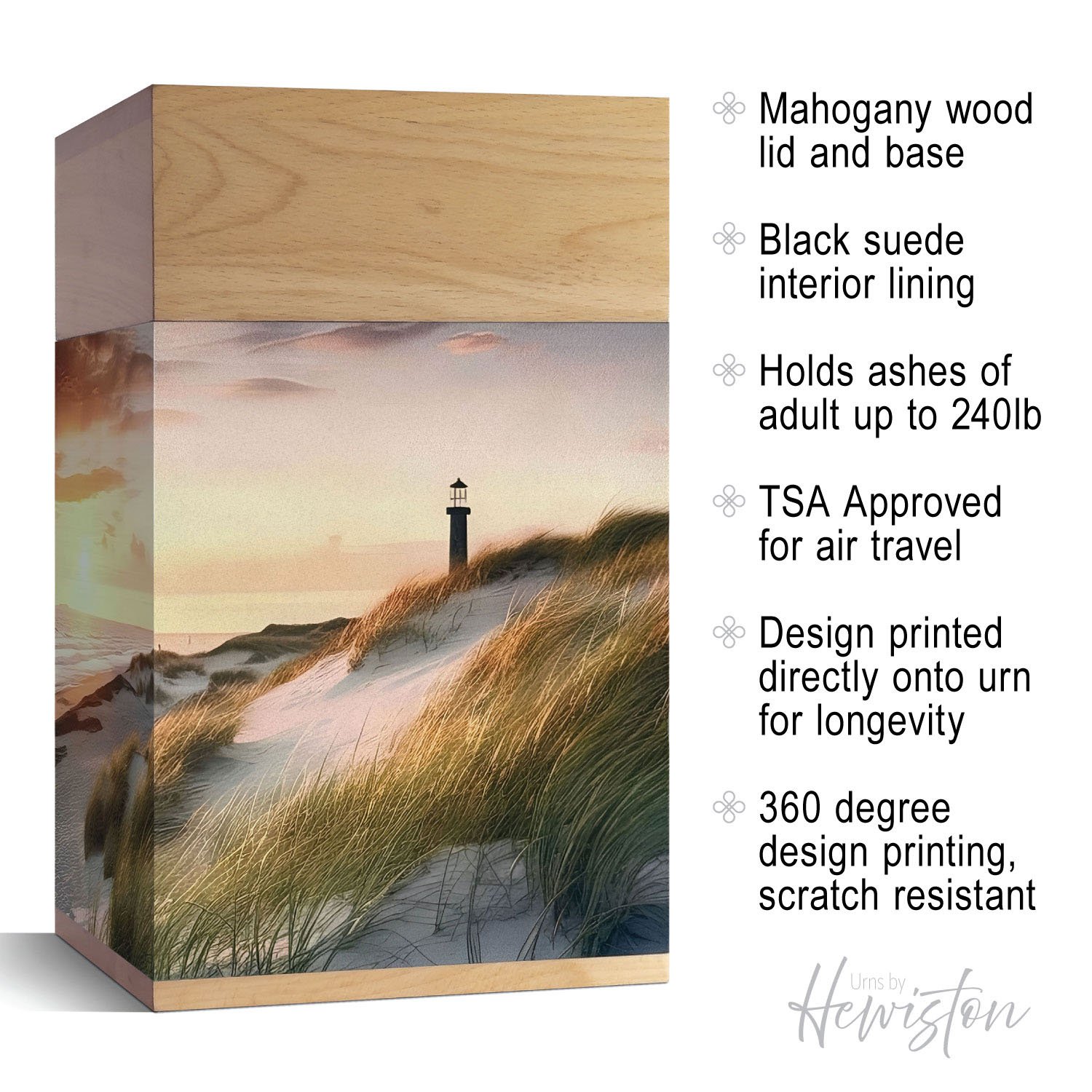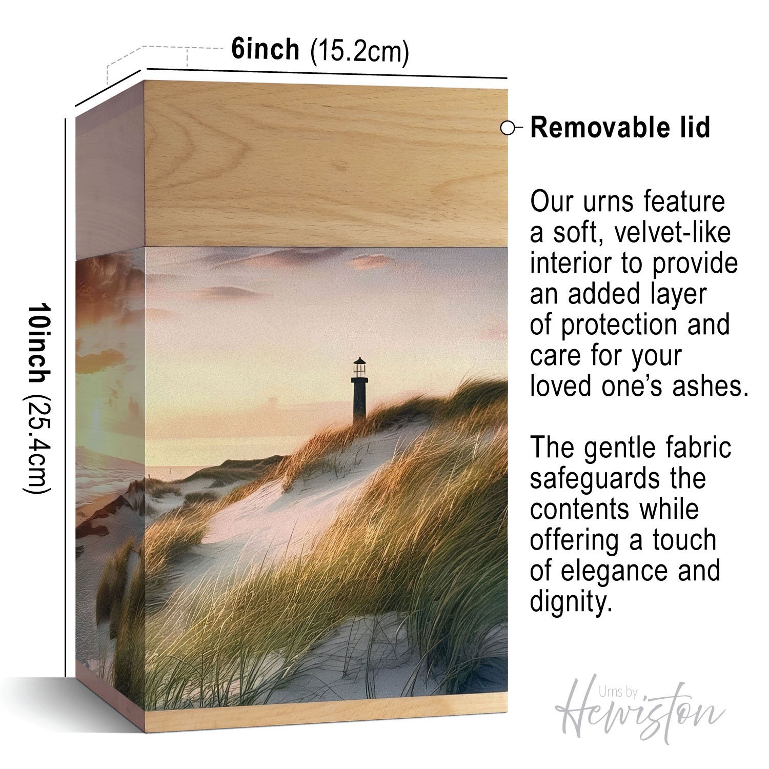 - TIMELESS STYLE: This large contemporary wooden urn for ashes complements any home décor, serving as both a beautiful memorial urn and a touching tribute. The lighthouse by the sea design symbolizes calm, strength and eternal guidance, reflecting your loved one’s connection to the peaceful presence of the ocean. Perfect for men or women, it’s a graceful urn for human ashes that honors life and memory with serene elegance.