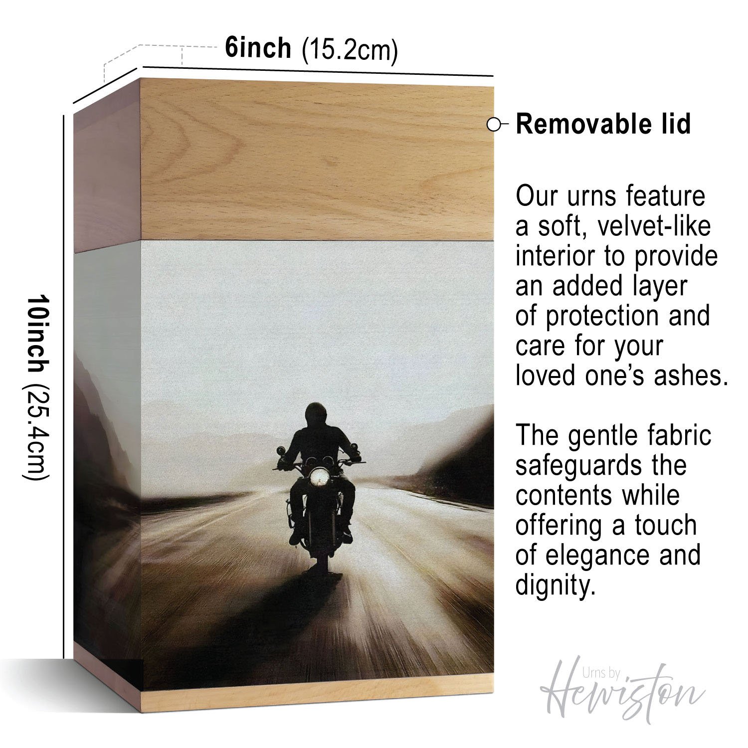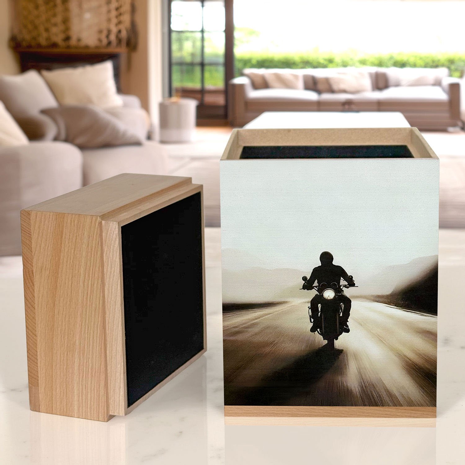 Please accept our heartfelt condolences. We are grateful for the opportunity to support you through this emotional time. This large wooden cremation urn for human ashes features a striking image of a motorbike rider cruising along an open road at sunset, surrounded by softly rolling hills. It captures the spirit of freedom, adventure, and the peaceful beauty of life’s journey. Crafted with care, this urn offers both beauty and dignity, serving as a meaningful funeral urn.