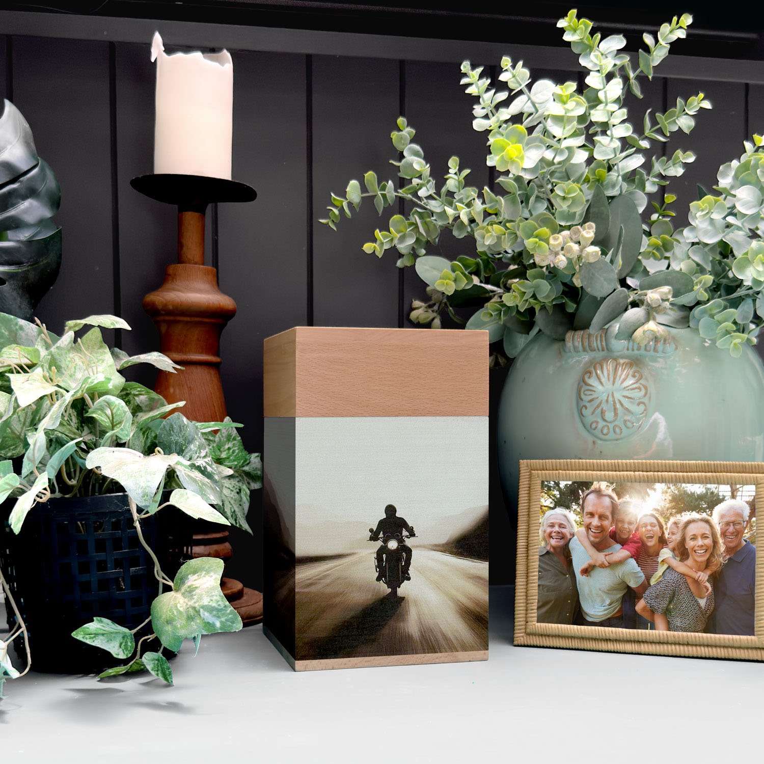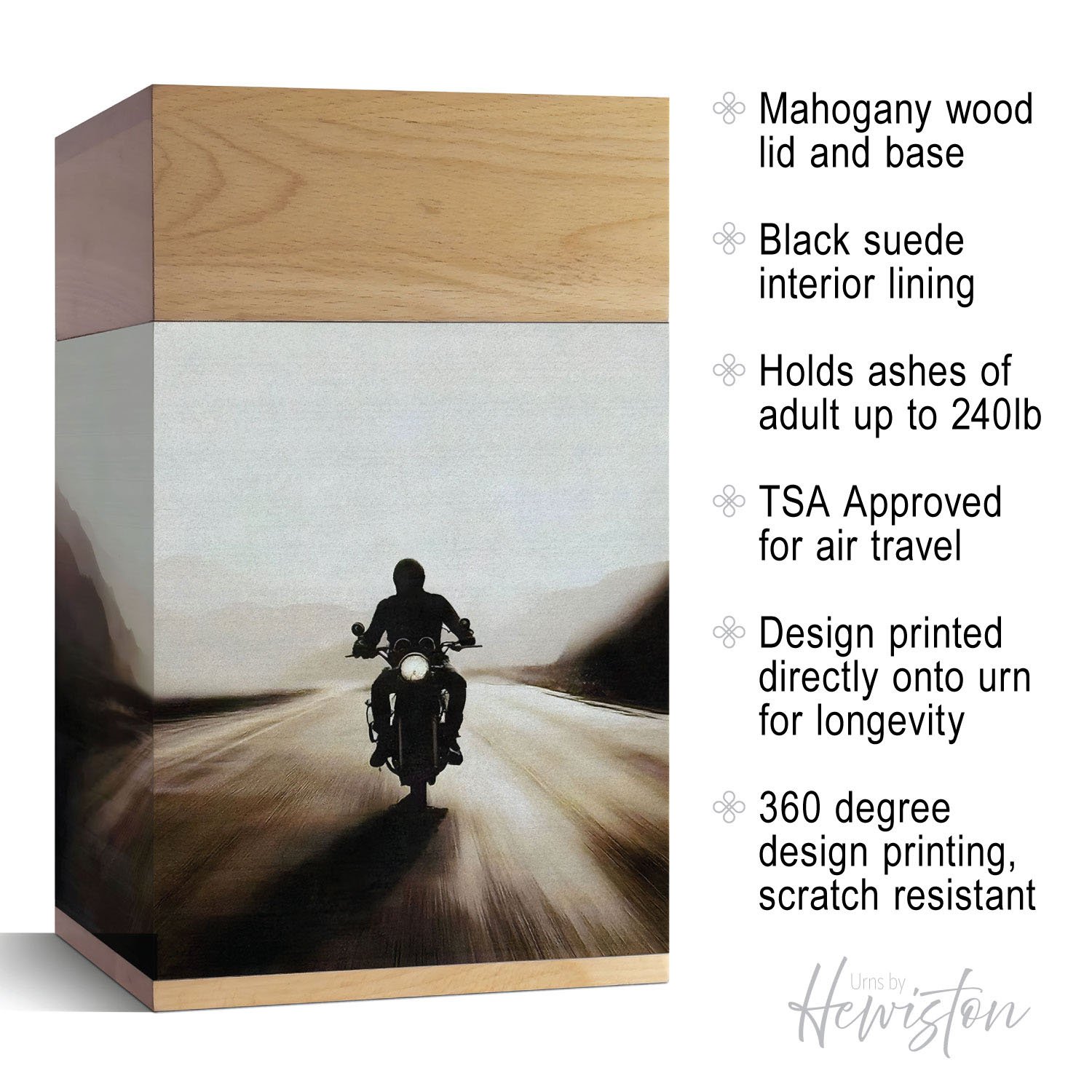 - TIMELESS STYLE: This large contemporary wooden urn for ashes complements any home décor, serving as both a beautiful memorial urn and a heartfelt tribute. The open-road sunset design symbolizes independence, serenity, and the everlasting spirit of adventure. Perfect for men or women, this elegant urn for human ashes celebrates your loved one’s passion for the ride and their journey beyond, honoring life and memory with timeless elegance.